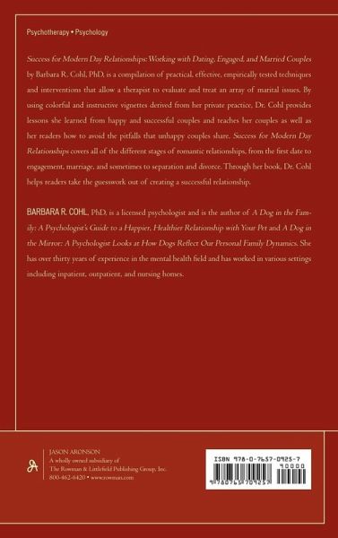 Success for Modern Day Relationships by Barbara R. Cohl is a compilation of practical, effective, empirically tested techniques and interventions that allow a therapist to evaluate and treat an array of marital issues. Cohl guides the reader through discussion, explanations, and examples based on her extensive experience with actual couples serving as illustrative vignettes.