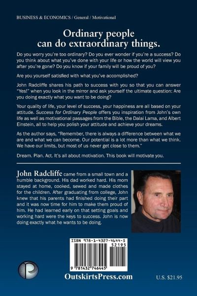 Ordinary people can do extraordinary things. Do you worry you're too ordinary? Do you ever wonder if you're a success? Do you think about what you've done with your life or how the world will view you after you're gone? Do you know if your family will be proud of you? Are you yourself satisfied with what you've accomplished? John Radcliffe shares his path to success with you so that you can answer "Yes!" when you look in the mirror and ask yourself the ultimate question: Are you doing exactly what you want to be doing? Your quality of life, your level of success, your happiness are all based on your attitude. Success for Ordinary People offers you inspiration from John's own life as well as motivational passages from the Bible, the Dalai Lama, and Albert Einstein, all to help you polish your attitude and achieve your dreams. As the author says, "Remember, there is always a difference between what we are and what we can become. Our potential is a lot more than what we think. We have our limits, but most of us never get close to them." Dream. Plan. Act. It's all about motivation. This book will motivate you.