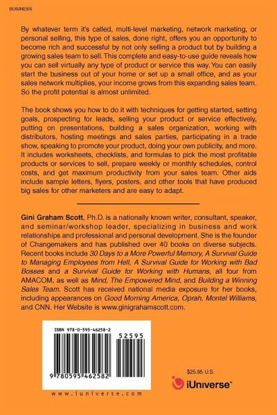 By whatever term it's called, multi-level marketing, network marketing, or personal selling, this type of sales, done right, offers you an opportunity to become rich and successful by not only selling a product but by building a growing sales team to sell. This complete and easy-to-use guide reveals how you can sell virtually any type of product or service this way. You can easily start the business out of your home or set up a small office, and as your sales network multiplies, your income grows from this expanding sales team. So the profit potential is almost unlimited. The book shows you how to do it with techniques for getting started, setting goals, prospecting for leads, selling your product or service effectively, putting on presentations, building a sales organization, working with distributors, hosting meetings and sales parties, participating in a trade show, speaking to promote your product, doing your own publicity, and more. It includes worksheets, checklists, and formulas to pick the most profitable products or services to sell, prepare weekly or monthly schedules, control costs, and get maximum productivity from your sales team. Other aids include sample letters, flyers, posters, and other tools that have produced big sales for other marketers and are easy to adapt.