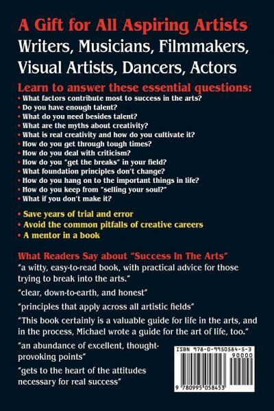 A Gift for All Aspiring Artists: Writers, Musicians, Filmmakers, Visual Artists, Dancers, Actors. These principles apply equally to all creative careers. Answers such questions as: What factors contribute most to success in the arts? Do you have enough talent? What do you need besides talent? What are the myths about creativity? What is real creativity and how do you cultivate it? How do you get through tough times? How do you deal with criticism? How do you "get the breaks" in your field? What foundation principles don't change? How do you hang on to the important things in life? How do you keep from "selling your soul?" What if you don't make it?
