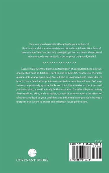 How can you charismatically captivate your audience? How can you claim a success when on the surface, it looks like a failure? How can you "feel" successfully revenged yet hurt no one in the process? How can you leave the world a better place than you found it? ***** Success Is Ele-MENTAL builds on a foundation of a decluttered and positive, energy-filled mind and defines, clarifies, and embeds FIFTY successful character qualities into your programming. You will also be invigorated with clever ideas of how to turn a failed attempt into an inspirited success. You will even find ways to become positively approachable and think like a leader, and not only will you be inspired, you will actually be the inspiration for others! By internalizing these qualities, skills, and strategies, you will be sure to capture the attention of others and lead by your confident and influential example while leaving a footprint that is sure to impact and enlighten future generations.