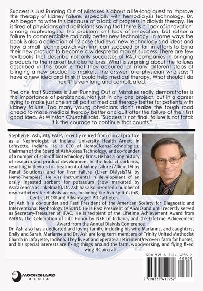 Success is Just Running Out of Mistakes is about a lifelong quest to improve the therapy of kidney failure, especially with hemodialysis technology. Dr. Ash began to write this because of a lack of progress in dialysis therapy. He is tired of physicians and politicians saying that there is a "lack of innovation" among nephrologists. The problem isn't a lack of innovation, but rather a failure to commercialize radically better new technology. In some ways the book is also a collection of 12 case studies of new technology and ideas and how a small technology-driven firm can succeed or fail in efforts to bring their new product to become a widespread market success. Few textbooks describe not only the successes of R&D companies in bringing products to the market but also their failures. What is surprising about the failures described in this book is that they occurred at many different steps of bringing a new product to market.. The answer to a physician who says "I have a new idea and think it could help medical therapy. What should I do next?" is very long and complicated. The one trait Success is Just Running Out of Mistakes demonstrates is the importance of persistence. Not just in any one project, but in a career trying to make just one small part of medical therapy better for patients with kidney failure. Too many young physicians don't realize the tough road ahead to make medical therapy better and quit after the failure of their first good idea. As Winston Churchill said, "Success is not final, failure is not fatal: it is the courage to continue that counts."