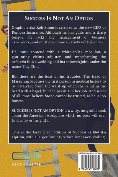 Graphic artist Rob Stone is selected as the new CEO of Remora Insurance. Although he has guile and a sharp tongue, he lacks any management or business experience, and must overcome a variety of challenges. He must contend with a white-collar rebellion, a gun-toting claims adjuster, and transforming the cafeteria into a wedding and bar mitzvah joint under the name Tray Chic. But these are the least of his troubles. The Head of Marketing becomes the first person in medical history to be paralyzed from the waist up when she is hit in the head with a bagel, but she persists in her job. And worst of all, most believe Stone cannot be trusted, as he is too honest. SUCCESS IS NOT AN OPTION is a witty, insightful book about the American workplace which no boss will ever find witty or insightful. This is the large print edition of Success Is Not An Option, with a larger font / typeface for easier reading.