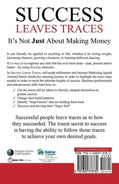 It can literally be applied to anything in life, whether it be losing weight, increasing finances, growing a business, or learning ballroom dancing. It's a way to re-engineer any task that has ever been done-past, present and/or future-by using five key elements. In Success Leaves Traces, self-made millionaire and Internet Marketing legend Armand Morin details his amazing journey in order to highlight the exact steps needed in order to reach the ultimate heights of success. Business professionals and entrepreneurs alike learn how to: Use the traces left by others to literally catapult themselves to greater success Change their belief patterns Identify "Stop Factors" that are holding them back Discover and develop their 'Super Self' Successful people leave traces as to how they succeeded. The truest secret to success is having the ability to follow those traces to achieve your own desired goals.