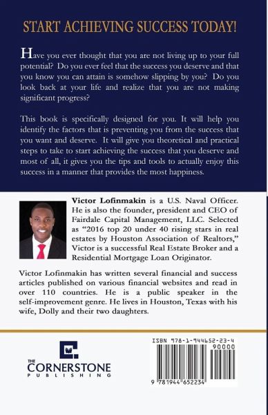 Have you ever thought that you are not living up to your full potential? Do you ever feel that the success you deserve and that you know you can attain is somehow slipping by you? Do you look back at your life and realize that you are not making significant progress? This book is specifically designed for you. It will help you identify the factors that is preventing you from the success that you want and deserve. It will give you theoretical and practical steps to take to start achieving the success that you deserve and most of all, it gives you the tips and tools to actually enjoy this success in a manner that provides the most happiness.
