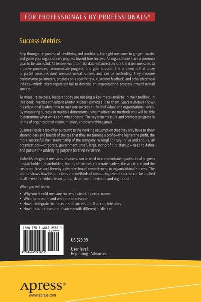 To measure success, leaders today are missing a key meta-analytic in their toolbox. In this book, metrics consultant Martin Klubeck provides it to them. Success Metrics steps you through the processof identifying and combining the right measures to gauge,narrate, and guide your organization's progress toward true success. All organizations have a common goal to be successful. All leaders want to make data-informed decisions and use measures to improve processes, communicate progress, and gain support. The problem is that proxy or partial measures don't measure overall success and can be misleading. They measure performance parameters, progress on a specific task, customer feedback, and other piecemeal indices-which taken separately fail to describe an organization's progress toward overall success.