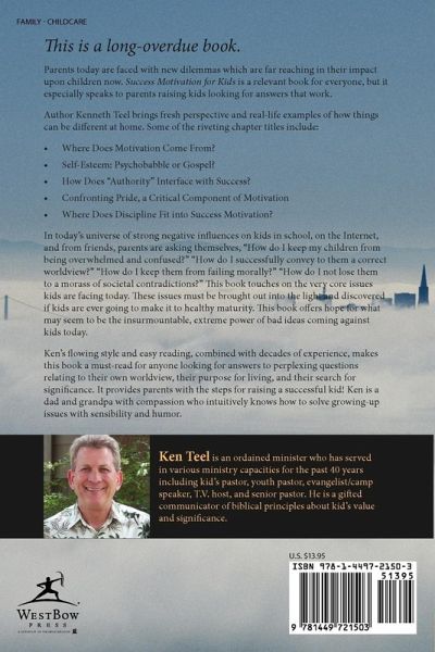 This is a long-overdue book. Parents today are faced with new dilemmas which are far reaching in their impact upon children now. Success Motivation for Kids is a relevant book for everyone, but it especially speaks to parents raising kids looking for answers that work. Author Kenneth Teel brings fresh perspective and real-life examples of how things can be different at home. Some of the riveting chapter titles include: ¿ Where Does Motivation Come From? ¿ Self-Esteem: Psychobabble or Gospel? ¿ How Does "Authority" Interface with Success? ¿ Confronting Pride, a Critical Component of Motivation ¿ Where Does Discipline Fit into Success Motivation? In today's universe of strong negative influences on kids in school, on the Internet, and from friends, parents are asking themselves, "How do I keep my children from being overwhelmed and confused?" "How do I successfully convey to them a correct worldview?" "How do I keep them from failing morally?" "How do I not lose them to a morass of societal contradictions?" This book touches on the very core issues kids are facing today. These issues must be brought out into the light and discovered if kids are ever going to make it to healthy maturity. This book offers hope for what may seem to be the insurmountable, extreme power of bad ideas coming against kids today. Ken's flowing style and easy reading, combined with decades of experience, makes this book a must-read for anyone looking for answers to perplexing questions relating to their own worldview, their purpose for living, and their search for significance. It provides parents with the steps for raising a successful kid! Ken is a dad and grandpa with compassion who intuitively knows how to solve growing-up issues with sensibility and humor.