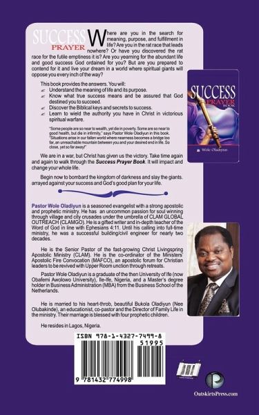 Success Prayer Where are you in the search for meaning, purpose, and fulfillment in life? Are you in the rat race that leads nowhere? Or have you discovered the rat race for the futile emptiness it is? Are you yearning for the abundant life and good success God ordained for you? But are you prepared to contend for it and live your dream in a world where spiritual giants will oppose you every inch of the way? This book provides the answers. You will: ¿ Understand the meaning of life and its purpose ¿ Know what true success means and be assured that God destined you to succeed. ¿ Discover the Biblical keys and secrets to success ¿ Learn to wield the authority you have in Christ in victorious spiritual warfare. "Some people are so near to wealth, yet die in poverty. Some are so near to good health, but die in infirmity" says Pastor Wole Oladiyun in this book. "Situations arise in our fallen world where nearness becomes a bridge too far, an unreachable mountain between you and your desired end in life!" We are at war, but Christ has given us the victory. Take time again and again to walk through the Success Prayer Book. It will impact and change your whole life. Begin now to bombard the kingdom of darkness and slay the giants arrayed against your success and God's good plan for your life.