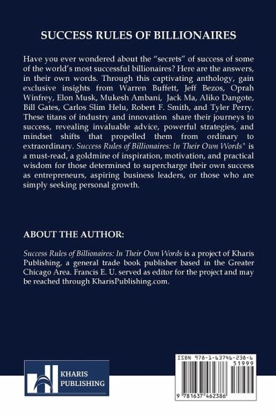 If you have ever wondered about the "secret" of success of some of the world's most successful billionaires, then, here is the answer, in their own words. In this captivating anthology, we have compiled exclusive insights from some of the world's most influential billionaires, including Warren Buffett, Elon Musk, Oprah Winfrey, Mukesh Ambani, Jeff Bezos, Jack Ma, Aliko Dangote, Bill Gates, Carlos Slim Helu, Robert F. Smith, and many others. These titans of industry and innovation have graciously shared their journey to success, revealing invaluable advice, powerful strategies, and mindset shifts that propelled them from ordinary to extraordinary. This book is a goldmine of inspiration, motivation, and practical wisdom for those determined to supercharge their own success. Whether you are an entrepreneur, aspiring business leader, or simply seeking personal growth, "Success Rules of Billionaires: In Their Own Words" is a must-read.