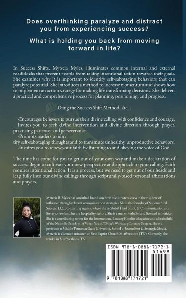 In Success Shifts, Mytecia Myles illuminates common internal and external roadblocks that prevent people from taking intentional action toward their goals. She examines why it is important to identify self-sabotaging behaviors that can paralyze potential. She introduces a method to increase momentum and shows how to implement an action strategy for making life-transforming decisions. The method encourages believers to pursue their divine calling with confidence and courage; Invites them to seek divine intervention and divine direction through prayer, practicing patience, and perseverance; Prompts readers to identify self-sabotaging thoughts and transmute unhealthy, unproductive behaviors and Inspires them to renew your faith by listening and obeying the voice of God. The time has come for you to get out of your own way and make a declaration of success. Begin to cultivate your new perspective. Faith requires intentional action. Adapt a new perspective to navigate your calling through scripturally-based insights.