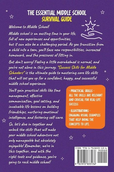 THE ESSENTIAL MIDDLE SCHOOL SURVIVAL GUIDE The Core Skills Every Middle Schooler Should Know to Become a Confident, Happy, and Successful Teen! Welcome to the middle school journey! This exciting phase in your child's life is full of changes, new experiences, and opportunities. They'll be making new friends, taking on more responsibilities, and exploring their independence. But it can be a bit of a rollercoaster too. Juggling homework, managing time, coping with emotions, and navigating social groups can be tricky for them (and for you!). It's a unique time. They've left the guided world of elementary school, and they're learning to take on more tasks, make decisions, and build relationships, all while balancing school and personal life. This can sometimes feel overwhelming and can lead to doubts and anxiety. It's a bit like learning to ride a bike but not yet knowing how to balance. What they really need is a helpful guide. And that's exactly what "Success Skills for Middle Schoolers" provides. This friendly and approachable guide equips your child with the practical skills they need to thrive. From managing time and staying organized to communicating effectively, building a growth mindset, and taking care of their emotions, this book covers it all. Our goal is to empower your child not just to survive middle school but to really enjoy this special time and prepare for the years ahead. If you appreciate clear, practical, and real-world advice, you'll love this book.