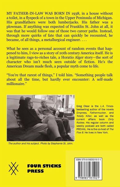 MY FATHER-IN-LAW WAS BORN IN 1938, in a house without a toilet, in a flyspeck of a town in the Upper Peninsula of Michigan. His grandfathers were both lumberjacks. His father was a plowman. If anything was expected of Franklin St. John at all, it was that he would follow one of those two career paths. Instead, through more quirks of fate that can quickly be recounted, he became, of all things, a metallurgical engineer. . . . What he sees as a personal account of random events that happened to him, I view as a story of 20th century America itself. He is a legitimate rags-to-riches tale, a Horatio Alger story-the sort of character who isn't much seen outside of fiction. He's the American Dream made flesh, a popular myth come to life. "You're that rarest of things," I told him. "Something people talk about all the time, but hardly ever encounter: A self-made millionaire." This book, by LA Times best-selling author Greg Olear, is that story.
