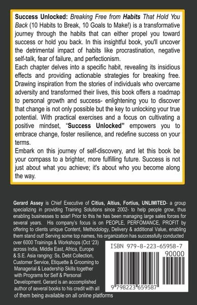 'Success Unlocked: Breaking Free from Habits That Hold You Back' (10 Habits to Break, 10 Goals to Make!) is a transformative journey through the habits that can either propel you toward success or hold you back. In this insightful book, you'll uncover the detrimental impact of habits like procrastination, negative self-talk, fear of failure, and perfectionism. Each chapter delves into a specific habit, revealing its insidious effects and providing actionable strategies for breaking free. Drawing inspiration from the stories of individuals who overcame adversity and transformed their lives, this book offers a roadmap to personal growth and success- enlightening you to discover that change is not only possible but the key to unlocking your true potential. With practical exercises and a focus on cultivating a positive mindset, "Success Unlocked" empowers you to embrace change, foster resilience, and redefine success on your terms. Embark on this journey of self-discovery, and let this book be your compass to a brighter, more fulfilling future. Success is not just about what you achieve; it's about who you become along the way.