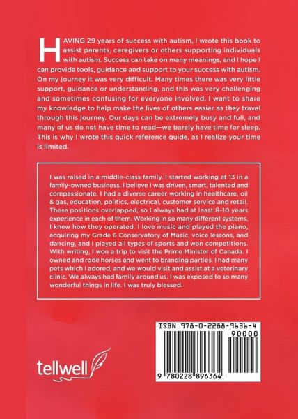 Having 29 years of success with autism, I wrote this book to assist parents, caregivers or others supporting individuals with autism. Success can take on many meanings, and I hope I can provide tools, guidance and support to your success with autism. On my journey it was very difficult. Many times there was very little support, guidance or understanding, and this was very challenging and sometimes confusing for everyone involved. I want to share my knowledge to help make the lives of others easier as they travel through this journey. Our days can be extremely busy and full, and many of us do not have time to read-we barely have time for sleep. This is why I wrote this quick reference guide, as I realize your time is limited.