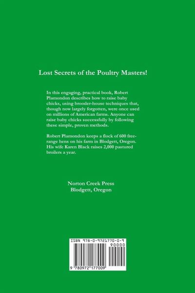 Baby chicks—can anything be more adorable? So cute, so soft, so helpless! Give your baby chicks a great start by reading the only book devoted to them, Success With Baby Chicks. Robert Plamondon had to read over a hundred poultry books to discover the sure-fire techniques in Success With Baby Chicks, and he tested them on his farm to find the ones that will work for you. Learn how to choose a good hatchery and a good breed, what kind of heat source to use, how to prepare the brooder area for your baby chicks, what to feed them, and how to avoid common mistakes. All of this is explained so clearly and completely that it has received praise from children, hobbyists, farmers, and poultry scientists alike. Whether you brood five chicks or five thousand at a time, this is the book for you, because its practical methods work with flocks of any size. And it will save you money. Learn how to build an insulated brooder in two hours for $20, keeping your chicks warmer and more comfortable than with overhead heat lamps, and saving two-thirds of the electricity into the bargain! Success With Baby Chicks is volume 1 of the Norton Creek Classics series. Visit http://www.nortoncreekpress.com for more of these practical, best-of-breed poultry books. Robert Plamondon is a writer/farmer/engineer who has been awarded over 30 U.S. patents and raises free-range chickens on his farm in Oregon.