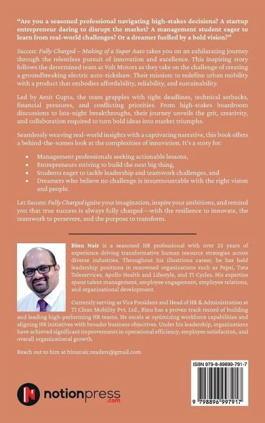 "Are you a seasoned professional navigating high-stakes decisions? A startup entrepreneur daring to disrupt the market? A management student eager to learn from real-world challenges? Or a dreamer fuelled by a bold vision?" Success: Fully Charged - Making of a Super Auto takes you on an exhilarating journey through the relentless pursuit of innovation and excellence. This inspiring story follows the determined team at Volt Motors as they take on the challenge of creating a groundbreaking electric auto-rickshaw. Their mission: to redefine urban mobility with a product that embodies affordability, reliability, and sustainability. Led by Amit Gupta, the team grapples with tight deadlines, technical setbacks, financial pressures, and conflicting priorities. From high-stakes boardroom discussions to late-night breakthroughs, their journey unveils the grit, creativity, and collaboration required to turn bold ideas into market triumphs. Seamlessly weaving real-world insights with a captivating narrative, this book offers a behind-the-scenes look at the complexities of innovation. It's a story for: Management professionals seeking actionable lessons, Entrepreneurs striving to build the next big thing, Students eager to tackle leadership and teamwork challenges, and Dreamers who believe no challenge is insurmountable with the right vision and people. Let Success: Fully Charged ignite your imagination, inspire your ambitions, and remind you that true success is always fully charged-with the resilience to innovate, the teamwork to persevere, and the purpose to transform.