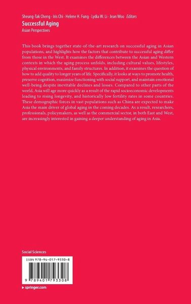 Chapter 1. Successful Aging: Concepts, Reflections and its Relevance to Asia; Sheung-Tak Cheng, Helene Fung, Lydia Li, Tianyuan Li, Jean Woo, and Iris Chi.- Chapter 2. Demographic and Family Trends in Asia; Sheung-Tak Cheng.- Chapter 3. Challenges to Successful Aging in Transitional China; Lydia W. Li and Jiaan Zhang.- Chapter 4. Successful Aging and Economic Security among Older Koreans; Suk-Young Kang and JeungKun Kim.- Chapter 5. Demographic and Structural Determinants of Successful Aging in Singapore; Angelique Chan and David B. Matchar.- Chapter 6. Policy and Program Measures for Successful Aging in Japan; Vanessa Yong, Yuka Minagawa and Yasuhiko Saito.- Chapter 7. Relationships between Adults and Parents in Asia; Kyungmin Kim, Yen-Pi Cheng, Steven H. Zarit and Karen L. Fingerman.- Chapter 8. The Road to Successful Aging: Older Adults and their Families in Japan; Keiko Katagiri and Tomoko Wakui.- Chapter 9. Social Networks and the Well-Being of Older Adults in Singapore; LengLeng Tang.- Chapter 10. The Intergenerational Support and Psychological Well-Being of the Elderly in Mainland of China; Zhang Wenjuan and Du Peng.- Chapter 11. Life Satisfaction among Older Adults in Taiwan; Ju-Ping Lin.- Chapter 12. Grandparenting and Volunteering among Older Adults in Hong Kong: A Dilemma; Lou Vivian W.Q. and Tong HongMei.- Chapter 13. Implications of Temporal Trends in Chronic Illness Burden; Ruby Yu, Pui Hing Chau and Jean Woo.- Chapter 14. The Role of Nutrition in Successful Aging; Kris Yuet-Wan Lok, Ruth Suk-Mei Chan and Jean Woo.- Chapter 15. The Role of Physical Activity in Successful Aging; Jean Woo, Forest Yau and Ruby Yu.- Chapter 16. Prevention of Cognitive Decline in Later Life; Linda C.W. Lam and Wai C. Chan.- Chapter 17. In the Pursuit of Emotionally Meaningful Goals: When Would the Older Asians Display or not to Display the Positivity Effect; Xin Zhang and Yuen Wan Ho.- Chapter 18. Psychological Adaptation of Older Workers: Findings from the Western and Eastern Countries; Dannii Y. Yeung and Henry C.Y. Ho.- Chapter 19. Cross-Cultural Differences in Attitudes about Aging: Moving beyond the East-West Dichotomy; Corinna E. Löckenhoff, Diana S. Lee, Katherine M.L. Buckner, Rashidat O. Moreira, Stephanie J. Martinez and Mary Q. Sun.- Chapter 20. Successful Aging in Asia: A Concerted Effort of the State, the Family, and the Individual; Sheung-Tak Cheng, Lydia W. Li, Jean Woo, Iris Chi and Helene H. Fung.