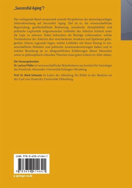 Der vorliegende Band versammelt zentrale Perspektiven der deutschsprachigen Alternsforschung auf Successful Aging. Ziel ist es, die wissenschaftliche Begründung, gesellschaftliche Bedeutung, moralische Akzeptabilität und politische Legitimität zeitgenössischer Leitbilder des Alter(n)s kritisch unter die Lupe zu nehmen. Dabei beleuchten die Beiträge insbesondere, welche Verständnisse des Alter(n)s den verschiedenen Ansätzen und Spielarten gelingenden Alterns zugrunde liegen, welche Leitbilder mit ihnen Einzug in wissenschaftliche Debatten und politische Auseinandersetzungen halten und in welcher Beziehung sie zu alltagsweltlichen Erfahrungen älterer Menschen sowie zu philosophisch-ethischen Theorien eines guten Lebens im Alter stehen.