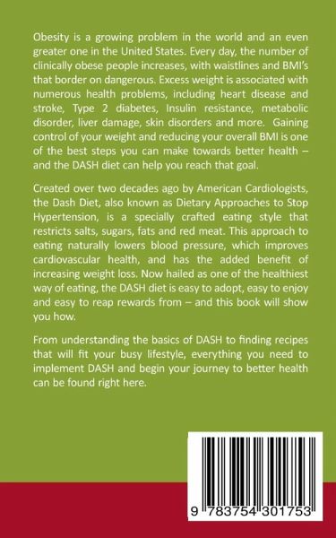 Obesity is a growing problem in the world and an even greater one in the United States. Every day, the number of clinically obese people increases, with waistlines and BMI's that border on dangerous. Excess weight is associated with numerous health problems, including heart disease and stroke, Type 2 diabetes, Insulin resistance, metabolic disorder, liver damage, skin disorders and more. Gaining control of your weight and reducing your overall BMI is one of the best steps you can make towards better health - and the DASH diet can help you reach that goal.Created over two decades ago by American Cardiologists, the Dash Diet, also known as Dietary Approaches to Stop Hypertension, is a specially crafted eating style that restricts salts, sugars, fats and red meat. This approach to eating naturally lowers blood pressure, which improves cardiovascular health, and has the added benefit of increasing weight loss. Now hailed as one of the healthiest way of eating, the DASH diet is easy to adopt, easy to enjoy and easy to reap rewards from - and this book will show you how.From understanding the basics of DASH to finding recipes that will fit your busy lifestyle, everything you need to implement DASH and begin your journey to better health can be found right here.