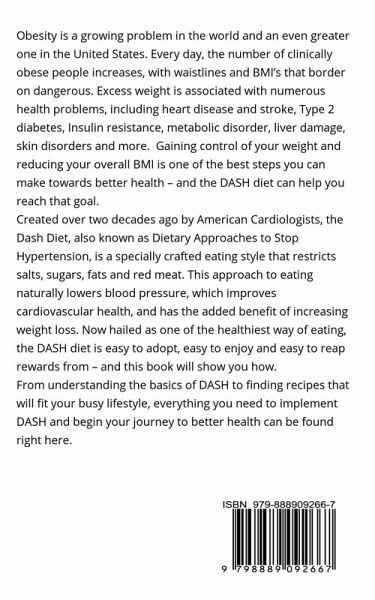 Obesity is a growing problem in the world and an even greater one in the United States. Every day, the number of clinically obese people increases, with waistlines and BMI's that border on dangerous. Excess weight is associated with numerous health problems, including heart disease and stroke, Type 2 diabetes, Insulin resistance, metabolic disorder, liver damage, skin disorders and more. Gaining control of your weight and reducing your overall BMI is one of the best steps you can make towards better health - and the DASH diet can help you reach that goal. Created over two decades ago by American Cardiologists, the Dash Diet, also known as Dietary Approaches to Stop Hypertension, is a specially crafted eating style that restricts salts, sugars, fats and red meat. This approach to eating naturally lowers blood pressure, which improves cardiovascular health, and has the added benefit of increasing weight loss. Now hailed as one of the healthiest way of eating, the DASH diet is easy to adopt, easy to enjoy and easy to reap rewards from - and this book will show you how. From understanding the basics of DASH to finding recipes that will fit your busy lifestyle, everything you need to implement DASH and begin your journey to better health can be found right here.