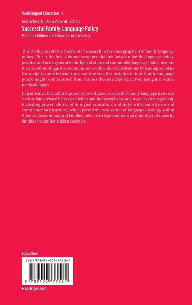 This book presents the forefront of research in the emerging field of family language policy. This is the first volume to explore the link between family language policy, practice and management in the light of state and community language policy in more than 20 ethno-linguistic communities worldwide. Contributions by leading scholars from eight countries and three continents offer insights in how family language policy might be interpreted from various theoretical perspectives, using innovative methodologies. In particular, the authors present novel data on successful family language practices such as faith-related literacy activities and homework sessions, as well as management, including prayer, choice of bilingual education, and links with mainstream and complementary learning, which permit the realization of language ideology within three contexts: immigrant families, inter-marriage families, and minority and majority families in conflict-ridden societies.