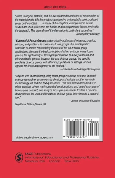 "Successful Focus Groups is a state-of-the-art text on focus group research methods. . . . Successful Focus Groups is a well-written document with clearly presented reasons why researchers should follow the guide lines presented. Additionally, this text is groundbreaking in its focus on topics that will advance knowledge of focus group research methods. . . . an improvement over prior treatises on focus groups. . . . Successful Focus Groups is clearly one of the most helpful treatises on focus group research. . . . this text will advance the quality of focus group research. I recommend Successful Focus Groups to anyone interested in learning about doing focus group research." --Susan A. Stearns in Qualitative Studies in Education "There is original material and the overall breadth and ease of presentation of the material make this the most comprehensive and readable book produced so far on the subject. . . . In many of the chapters, examples from actual studies are used to illustrate the basics or discuss particular issues involved in the approach. This grounding of the discussion is particularly appealing." --Contemporary Sociology "This book systematically addresses the issues, practice, wisdom, and problems in conducting focus groups. It is an integrated collection of articles representing the state of the art in focus group applications. It covers the basic principles of when and how to use focus groups, the applicability of focus group interviews to survey research and other methods, general issues in the use of focus groups, the specific problems of focus groups with different populations or settings, and an agenda for future development of the method." --Bulletin de Methodologie Sociologique "Anyone who is considering using focus group interviews as a tool in social science research or as a means to develop and validate another research methodology will find this text quite useful. This well-written and edited text offers practical advice, methodologic considerations, and actual examples of how to plan, conduct, and analyze focus group research. It offers a practical discussion on the uses and limitations of focus group interviews as a research tool." --Journal of Nutrition Education While various books introduce the basics of focus groups, Successful Focus Groups is the first volume to systematically address the issues, practice wisdom, and problems in conducting focus groups from the perspective of those who have done the most work using these methods in social science settings. The result is a well-integrated collection of articles that represents the state-of-the-art in focus group applications, written by a knowledgeable, interdisciplinary group of scholars. The chapters cover the basic principles of when and how to use focus groups, the applicability of focus group interviews to survey research and other methods, general issues in the use of focus groups, the specific problems of focus groups with different populations or settings, and an agenda for future development of the method. Authoritative and readable, this volume is essential reading for social scientists now using, or contemplating, focus groups in their research, and a useful, practical text for students of research methods.
