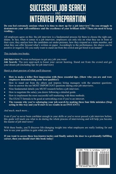 Do you feel extremely anxious when it is time to show up for a job interview? Do you struggle to demonstrate your self-confidence and the excellence of your brilliant skills? Then you need to keep reading... All employers agree on this: the job interview is a fundamental process for them to choose the right candidate. In fact, when it comes to a job interview, employers can only rely on what they see in front of their eyes; they analyse how the candidates act under pressure, how they respond as a team member, and what they can offer beyond what's written on paper. Accordingly to the performance, the choice can be positive or negative. Do you really want to stand out from the crowd and get hired in an instant? This includes two books: Job Interview: Proven techniques to get any job you want Job Search: The new approach to boost your career hunting. Stand out from the crowd and get your dream job (including tips for job interview) Here's a short preview of what you'll discover: How to make a killer first impression with these essential tips. (Show who you are and wow employers demonstrating your best qualities!) How to stand out from the others and impress hiring managers with the smartest questions. How to answer the ten MOST IMPORTANT questions during your job interviews. Nine fundamental details you MUST research before a job interview. How to negotiate the salary you desire following a detailed guide. How to implement the most successful self-marketing with these methods. The EXACT formula to be good at networking even if you're an introvert. The reasons why you're sabotaging your job search by making these four little mistakes (Stop acting in this way and you'll start to see results in an INSTANT!) And much, much more... Even if you've never been confident enough in your skills or you've never passed a job interview before, this guide will teach you what to do during the whole process of interviewing and will help you become the master of job interviews! With these books, you'll discover life-changing insight into what employers are really looking for and how to use your qualities to gain what you want. If you want to access these less-known tactics and finally unlock the door to a profoundly fulfilling career, then you should start this book today!
