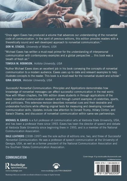 Successful Nonverbal Communication: Principles and Applications demonstrates how knowledge of nonverbal messages can affect successful communication in the real world. Now with fifteen chapters, the fifth edition draws students in through applications of the latest nonverbal communication research and through current examples of celebrities, sports, and politicians. This extensive revision describes nonverbal cues and their desirable and undesirable functions while offering original tests for measuring and developing nonverbal communication skills. Updates include new attention to Donald Trump, Hillary Clinton, and Barack Obama, and discussion of nonverbal communication within same-sex partnerships.