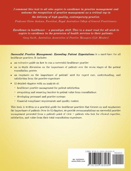 Successful Practice Management: Exceeding Patient Expectations is a must-have for all healthcare practices. It includes an extensive guide on how to run a successful healthcare practice, an in-depth discussion on the importance of patients over the seven stages of the patient consultation process, and an emphasis on the importance of patients' need for expert care, understanding, and satisfaction from the practice experience. There are 12 detailed chapters that provide the reader with an analysis of healthcare practice management for patient satisfaction, recognising and removing barriers to patient value from consultations, developing personnel and practice systems, and financial compliance requirements and quality control. This book is written as a practical guide for healthcare practices that focuses on and emphasises the importance of patients.