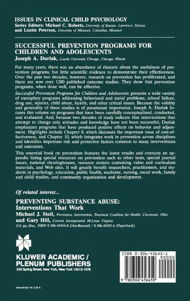 Successful Prevention Programs for Children and Adolescents presents a wide variety of exemplary programs addressing behavioral and social problems, school failure, drug use, injuries, child abuse, physical health, and other critical issues. The validity and generality of each study's results are given special attention, and outcomes involving actual behavioral change are emphasized. A special appendix lists resources on prevention, including other texts, special journal issues, national clearinghouses, resource centers containing videos and curriculum materials, and Web sites.