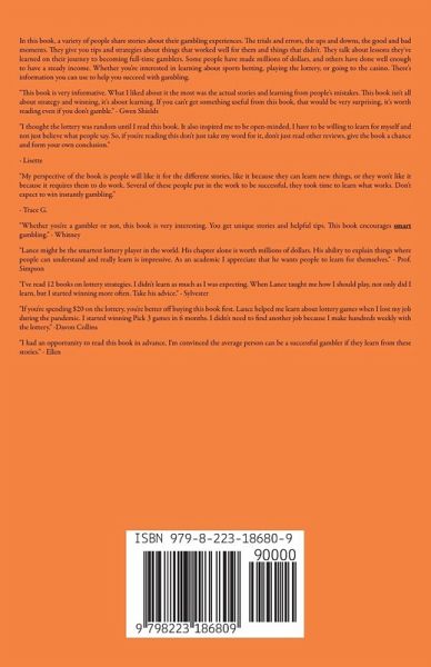 In this book, a variety of people share stories about their gambling experiences. The trials and errors, the ups and downs, the good and bad moments. They give you tips and strategies about things that worked well for them and things that didn't. They talk about lessons they've learned on their journey to becoming full-time gamblers. Some people have made millions of dollars, and others have done well enough to have a steady income. Whether you're interested in learning about sports betting, playing the lottery, or going to the casino. There's information you can use to help you succeed with gambling. "I've read 12 books on lottery strategies. I didn't learn as much as I was expecting. When Lance taught me how I should play, not only did I learn, but I started winning more often. Take his advice." - Sylvester "I had an opportunity to read this book in advance. I'm convinced the average person can be a successful gambler if they learn from these stories." - Ellen "Whether you're a gambler or not, this book is very interesting. You get unique stories and helpful tips. This book encourages smart gambling." - Whitney "Lance might be the smartest lottery player in the world. His chapter alone is worth millions of dollars. His ability to explain things where people can understand and really learn is impressive. As an academic I appreciate that he wants people to learn for themselves." - Prof. Simpson "If you're spending $20 on the lottery, you're better off buying this book first. Lance helped me learn about lottery games when I lost my job during the pandemic. I started winning Pick 3 games in 6 months. I didn't need to find another job because I make hundreds weekly with the lottery." -Davon Collins