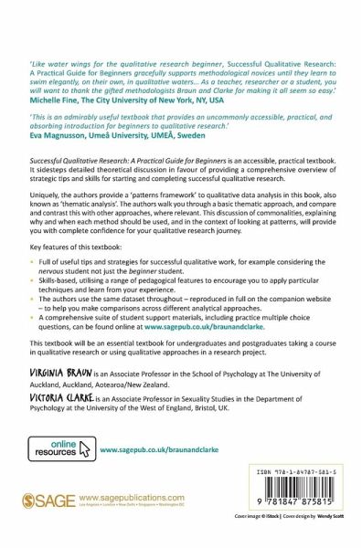 'Like water wings for the qualitative research beginner, Successful Qualitative Research: A Practical Guide for Beginners gracefully supports methodological novices until they learn to swim elegantly, on their own, in qualitative waters... As a teacher, researcher or a student, you will want to thank the gifted methodologists Braun and Clarke for making it all seem so easy'