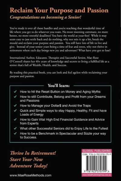 Reclaim your purpose and passion. Congratulations on becoming a senior! You've made it over all those hurdles and you're reaching that wonderful time of life wherre you get to do whatever you want. No more morning commute, no more bosses, no more stressful deadlines! You have the world at your feet! While it may seem easy to just settle back and do nothing, why not mix it up a bit, break the mould and reclaim your purpose and passion. You still have lots of life to live and give. Instead of your senior years being a time of fear and stress, why not thrive in retirement where each day brings new joy and adventure? What have you got to lose? International author, educator, therapist and successful senior, Mae-Rose O'Connell shares her 40+ years of knowledge and secrets to living a fulfilled life as a senior that's full of wealth, health and success. By reading this practical book, you can look and feel ageless while reclaiming your purpose and passion. You'll learn:How to hit the reset button on money and aging myths How to still contribute, belong and profit from your dreams and passions How to manage your dollars and avoid the traps Quick and simple ways to stay happy, healthy, fit and have loads of energy How to gain vital high end financial guidance and advice from experts What other successful seniors did to enjoy life to the fullest How to be a benchmark in spectacular and sizzle your way to success Thrive in retirement! Start your new adventure today!