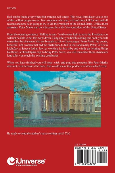 Evil can be found everywhere but extreme evil is rare. This novel introduces you to one of the evillest people to ever live; someone who can, will and does kill for any and all reasons and now he is going to try to kill the President of the United States. Unlike most assassins, Peter Marks can do it because he is the Vice-president of the United States. From the opening sentence "Killing is easy." to the tense fight to save the President you will not be able to put this book down. Long after you finish reading this book you will remember the characters that are brought to life on those pages. From Portia, the young, beautiful, rich woman that had the misfortune to fall in love and marry Peter; to Kevin Lightfoot a Seneca Indian lawyer working for his tribe and winds up helping Philip DeMarco, a Philadelphia cop, to bring Peter down; you will remember these characters long after you reach the exciting conclusion. When you have finished you will hope, wish, and pray that someone like Peter Marks does not exist because if he does; that would mean that perfect evil does indeed exist. Be ready to read the author's next exciting novel TLC