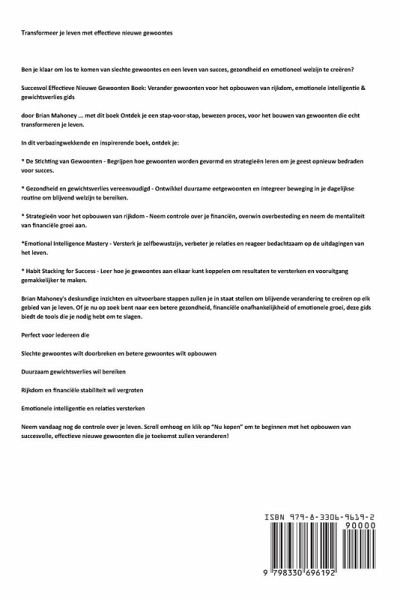 Transformeer je leven met effectieve nieuwe gewoontes Ben je klaar om los te komen van slechte gewoontes en een leven van succes, gezondheid en emotioneel welzijn te creëren? Succesvol Effectieve Nieuwe Gewoonten Boek: Verander gewoonten voor het opbouwen van rijkdom, emotionele intelligentie & gewichtsverlies gids door Brian Mahoney ... met dit boek Ontdek je een stap-voor-stap, bewezen proces, voor het bouwen van gewoonten die echt transformeren je leven. In dit verbazingwekkende en inspirerende boek, ontdek je: * De Stichting van Gewoonten - Begrijpen hoe gewoonten worden gevormd en strategieën leren om je geest opnieuw bedraden voor succes. * Gezondheid en gewichtsverlies vereenvoudigd - Ontwikkel duurzame eetgewoonten en integreer beweging in je dagelijkse routine om blijvend welzijn te bereiken. * Strategieën voor het opbouwen van rijkdom - Neem controle over je financiën, overwin overbesteding en neem de mentaliteit van financiële groei aan. *Emotional Intelligence Mastery - Versterk je zelfbewustzijn, verbeter je relaties en reageer bedachtzaam op de uitdagingen van het leven. * Habit Stacking for Success - Leer hoe je gewoontes aan elkaar kunt koppelen om resultaten te versterken en vooruitgang gemakkelijker te maken. Brian Mahoney's deskundige inzichten en uitvoerbare stappen zullen je in staat stellen om blijvende verandering te creëren op elk gebied van je leven. Of je nu op zoek bent naar een betere gezondheid, financiële onafhankelijkheid of emotionele groei, deze gids biedt de tools die je nodig hebt om te slagen. Perfect voor iedereen die Slechte gewoontes wilt doorbreken en betere gewoontes wilt opbouwen Duurzaam gewichtsverlies wil bereiken Rijkdom en financiële stabiliteit wil vergroten Emotionele intelligentie en relaties versterken Neem vandaag nog de controle over je leven. Scroll omhoog en klik op "Nu kopen" om te beginnen met het opbouwen van succesvolle, effectieve nieuwe gewoonten die je toekomst zullen veranderen!