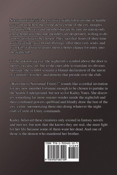 Nocturnal Trinity is the exclusive nightclub everyone in Seattle raves about, where the crème de la crème of the city mingles and parties. Access and membership are by rare invitation only. Those hopeful to become members are desperately willing to do almost anything to be chosen. They sacrifice hours of their time waiting in line, give blood offerings, offer their very souls, and even kill, if doing so grants them a better chance for entry into the nightclub. To the unknowing eye, the nightclub's symbol above the door is merely occultic art, but to the ones able to translate its obvious message, the symbol screams a blatant declaration of the union of vampires, witches, and demons that preside over the club. "Welcome to Nocturnal Trinity!" sounds like a cordial invitation for any new member fortunate enough to be chosen to partake in the Seattle Underground, but not so for Kailey Yates. She discovers something far more sinister resides inside the nightclub and their combined powers spellbind and blindly draw the lust of the city's elite, mesmerizing them into doing whatever the nightclub's Circle of Unity commands. Kailey believed these creatures only existed in fantasy novels and movies, but now that she knows they are real, she must fight for her life because some of them want her dead. And one of those is the demon who murdered her brother.