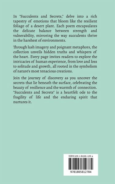 In "Succulents and Secrets," delve into a rich tapestry of emotions that bloom like the resilient foliage of a desert plant. Each poem encapsulates the delicate balance between strength and vulnerability, mirroring the way succulents thrive in the harshest of environments. Through lush imagery and poignant metaphors, the collection unveils hidden truths and whispers of the heart. Every page invites readers to explore the intricacies of human experience, from love and loss to solitude and growth, all rooted in the symbolism of nature's most tenacious creations. Join the journey of discovery as you uncover the secrets that lie beneath the surface, celebrating the beauty of resilience and the warmth of connection. "Succulents and Secrets" is a heartfelt ode to the fragility of life and the enduring spirit that nurtures it.