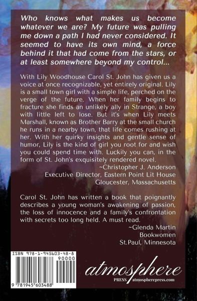 With Lily Woodhouse Carol St. John has given us a voice at once recognizable, yet entirely original. Lily is a small town girl with a simple life, perched on the verge of the future. When her family begins to fracture she finds an unlikely ally in Strange, a boy with little left to lose. But it’s when Lily meets Marshall, known as Brother Barry at the small church he runs in a nearby town, that life comes rushing at her. With her quirky insights and gentle sense of humor, Lily is the kind of girl you root for and wish you could spend time with. Luckily you can, in the form of St. John’s exquisitely rendered novel. ~Christopher J. Anderson Executive Director, Eastern Point Lit House Gloucester, Massachusetts Carol St. John has written a book that poignantly describes a young woman’s awakening of passion, the loss of innocence and a family’s confrontation with secrets too long held. A must read. ~Glenda Martin Bookwomen St.Paul, Minnesota
