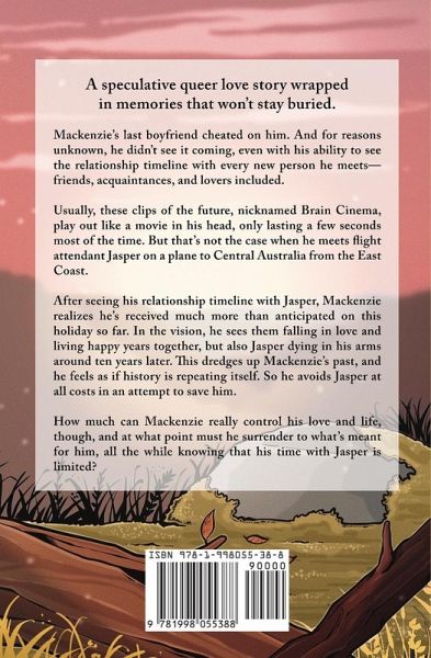 A speculative queer love story wrapped in memories that won't stay buried. Mackenzie's last boyfriend cheated on him. And for reasons unknown, he didn't see it coming, even with his ability to see the relationship timeline with every new person he meets-friends, acquaintances, and lovers included. Usually, these clips of the future, nicknamed Brain Cinema, play out like a movie in his head, only lasting a few seconds most of the time. But that's not the case when he meets flight attendant Jasper on a plane to Central Australia from the East Coast. After seeing his relationship timeline with Jasper, Mackenzie realizes he's received much more than anticipated on this holiday so far. In the vision, he sees them falling in love and living happy years together, but also Jasper dying in his arms around ten years later. This dredges up Mackenzie's past, and he feels as if history is repeating itself. So he avoids Jasper at all costs in an attempt to save him. How much can Mackenzie really control his love and life, though, and at what point must he surrender to what's meant for him, all the while knowing that his time with Jasper is limited?