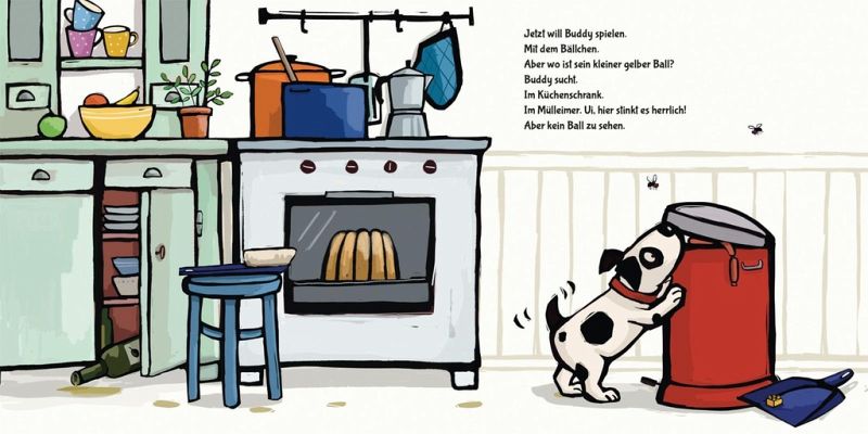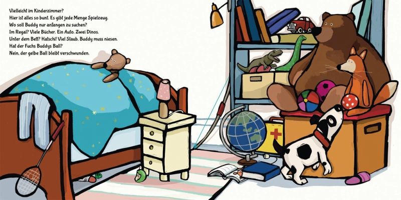 Nun sucht er im Haus und im Garten seinen kleinen gelben Ball. Und die kleinen Tierfreunde können ihn bei der Suche begleiten.