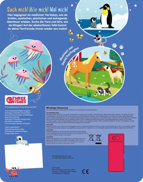 ¿ Für kleine Tier-Fans – suche, höre und male süße Tier-Babys! ¿ Soundbuch mit 12 Sounds, Zeichentafel und Wisch-und-Weg-Stift ¿ Liebevoll illustrierte Wimmelbilder ¿ Stabile Pappeseiten mit runden Ecken für die Allerkleinsten ¿ Trainiert Feinmotorik, Kommunikation und Konzentration 3-in-1: Wimmelbuch mit 12 Suchbildern, Soundbuch und Maltafel in einem! Suche die Tiere, höre, wie sie klingen und male sie auf die Zeichentafel! Auf jedem Wimmelbild haben sich viele kleine Tier-Babys versteckt, die von dir gefunden werden wollen! Endecke das kleine Krokodil im Dschungel, die kleine Qualle im Meer oder das kleine Zebra in der Savanne! Drücke die Soundbuttons und erforsche, welche Laute die Tiere machen. Mithilfe der Malvorlagen und dem beigelegten Wisch-und-Weg-Stift kannst du die Tier-Babys ganz einfach und immer wieder neu auf deine Zeichentafel malen. Suchaufgaben und kurze Texte regen zusätzlich zum Mitmachen und Erzählen an. Mit diesem Buch wirst du ganz bestimmt zu einer/einem echten Tier-Forscher*in! Das multifunktionale Buch ideal für zu Hause oder unterwegs und bietet stundenlange Beschäftigung, ohne dabei Zeit am Bildschirm zu verbringen. Ein passendes Geschenk für alle kleinen Tier-Fans und ideal geeignet für kleine Kinderhände. Das Buch fördert ganz nebenbei Feinmotorik, Kommunikation und Konzentration. Achtung: Nicht geeignet für Kinder unter 3 Jahren. Erstickungsgefahr wegen verschluckbarer Kleinteile.