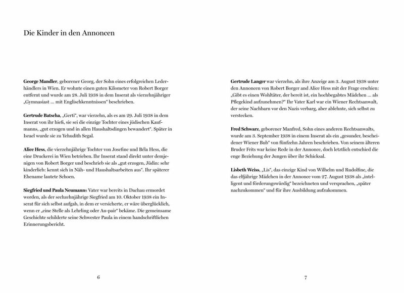 Wien, 1938. Verzweifelt versuchen jüdische Eltern, ihre Kinder vor den Nazis in Sicherheit zu bringen. In ihrer Not schalten sie Kleinanzeigen im »Manchester Guardian«, in denen sie ihre eigenen Kinder ausschreiben, um ihnen ein Überleben in der Fremde zu sichern - obwohl sie wissen, dass sie sich nie wiedersehen werden. Jahrzehnte später stößt der Journalist Julian Borger auf eine dieser Anzeigen und erkennt den Namen eines der Kinder: Robert Borger. Sein Vater. Es ist der Beginn einer Recherche, die Julian Borger mitten hinein führt in ein dunkles Familiengeheimnis. Und Anlass für ihn ist, die Spuren von sieben weiteren Kindern zu verfolgen, deren Schicksalsreise von Wien aus ins Exil nach Shanghai, in die Arme von niederländischen Schmugglern, an die Seite französischer Widerstandskämpfer - oder ins KZ Auschwitz führte.