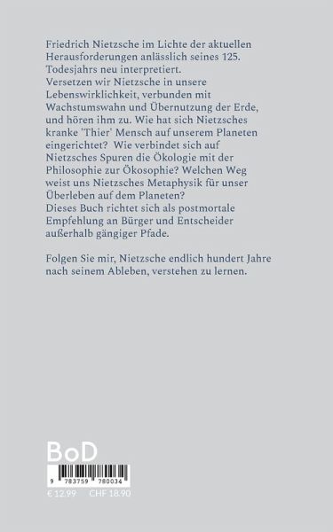 Friedrich Nietzsche im Lichte der aktuellen Herausforderungen anlässlich seines 125. Todesjahrs neu interpretiert. Versetzen wir Nietzsche in unsere Lebenswirklichkeit, verbunden mit Wachstumswahn und Übernutzung der Erde, und hören ihm zu. Wie hat sich Nietzsches kranke 'Thier' Mensch auf unserem Planeten eingerichtet? Wie verbindet sich auf Nietzsches Spuren die Ökologie mit der Philosophie zur Ökosophie? Welchen Weg weist uns Nietzsches Metaphysik für unser Überleben auf dem Planeten? Dieses Buch richtet sich als postmortale Empfehlung an Bürger und Entscheider außerhalb gängiger Pfade. Folgen Sie mir, Nietzsche endlich hundert Jahre nach seinem Ableben, verstehen zu lernen.