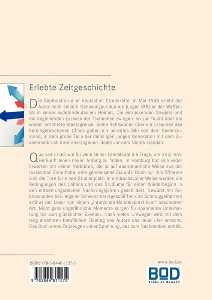 Erlebte ZeitgeschichteDie Kapitulation aller deutschen Streitkräfte im Mai 1945 erlebt der Autor nach seinem Genesungsurlaub als junger Offizier der Waffen-SS in seiner sudetendeutschen Heimat. Die einrückenden Sowjets und die beginnenden Exzesse der Tschechen zwingen ihn zur Flucht über die wieder errichtete Staatsgrenze. Seine Reflexionen über die Ursachen des hereingebrochenen Chaos geben ein beredtes Bild von dem Seelenzustand, in dem große Teile der damaligen jungen Generation mit dem Zusammenbruch ihrer anerzogenen Ideale vor dem Nichts standen.Quo vadis hieß wie für viele seiner Landsleute die Frage, um trotz ihrer Herkunft einen neuen Anfang zu finden. In Hamburg bot sich wider Erwarten mit seiner Jugendliebe, die er auf abenteuerliche Weise aus der Sowjetzone holte, eine gemeinsame Zukunft. Doch nur ihm öffneten sich die Tore für einen Studienplatz. In eindrucksvoller Weise werden die Bedingungen des Lebens und des Studiums für einen Wiederbeginn in den entbehrungsreichen Nachkriegsjahren geschildert. Gewürzt mit Robinsonaden bei illegalen Schmuggelfahrten erfährt der Leser von einem "Interzonen-Handelspraktikum" sui generis. Ein Buch, das zum Nachdenken anhält.