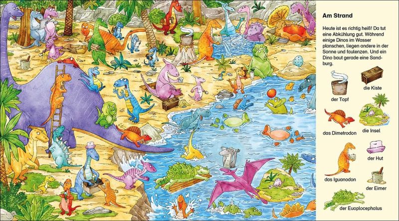 Ein Pappbilderbuch zum Thema Dinosaurier für Kinder ab 2 Jahren, das in wimmeligen Bildern zum Entdecken und Wiedererkennen einlädt und so den Spracherwerb unterstützt.