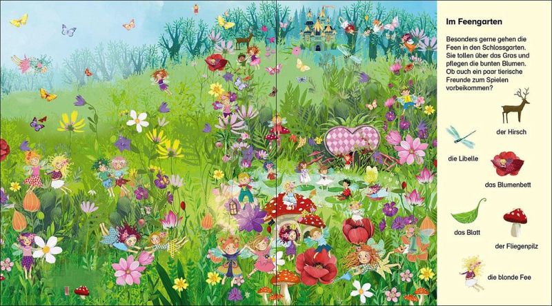 Lass uns gemeinsam den Zauberwald erkunden, das gläserne Schloss besuchen oder über die Blumenwiese tollen. In diesem magischen Reich wird es nie langweilig! Ein fantastischer Wimmelspaß zum Suchen und Finden!