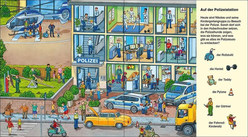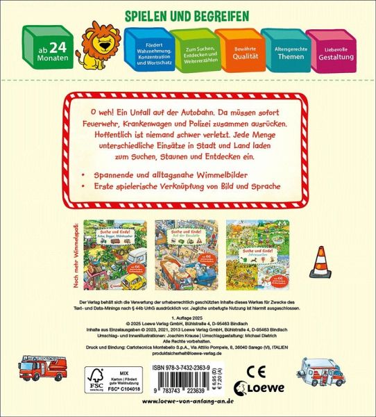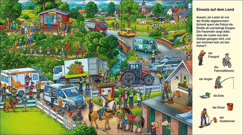 O weh! Ein Unfall auf der Autobahn. Da müssen sofort Feuerwehr, Krankenwagen und Polizei zusammen ausrücken. Hoffentlich ist niemand schwer verletzt. Jede Menge unterschiedliche Einsätze in Stadt und Land laden zum Suchen, Staunen und Entdecken ein.