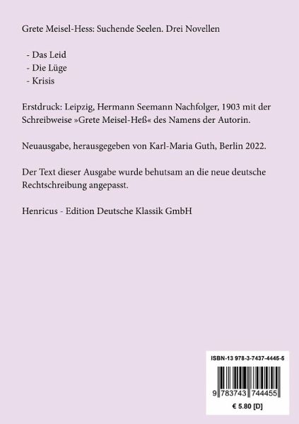 Grete Meisel-Hess: Suchende Seelen. Drei NovellenErstdruck: Leipzig, Hermann Seemann Nachfolger, 1903 mit der Schreibweise »Grete Meisel-Heß« des Namens der Autorin.Inhaltsverzeichnis:Neuausgabe, herausgegeben von Karl-Maria Guth, Berlin 2023.Der Text dieser Ausgabe wurde behutsam an die neue deutsche Rechtschreibung angepasst.Umschlagabbildung: Grete Meisel-Hess (Fotografie, 1903)Gesetzt aus der Minion Pro, 11 pt.Die Sammlung Hofenberg erscheint im Verlag Henricus - Edition Deutsche Klassik GmbH, Berlin