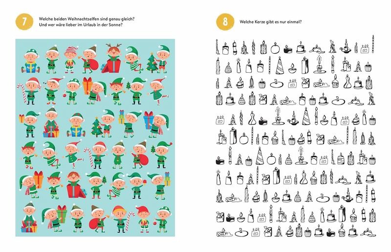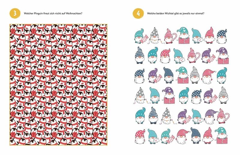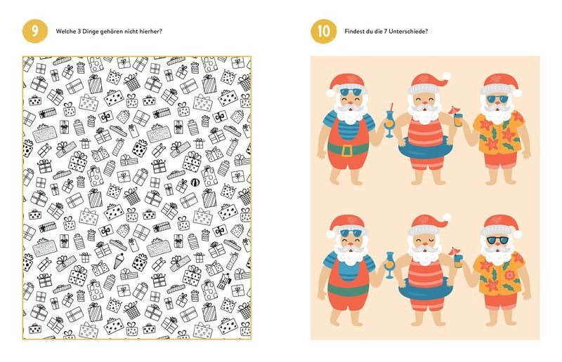 Wichtel, Weihnachtsmänner, Geschenke, Weihnachtsbäume, Ugly Sweater, Christbaumkugeln und vieles anderes mehr sorgen in diesem witzigen Rätselbuch für gute Laune und kleine, fröhliche Rate-Ruhepausen im Advent.