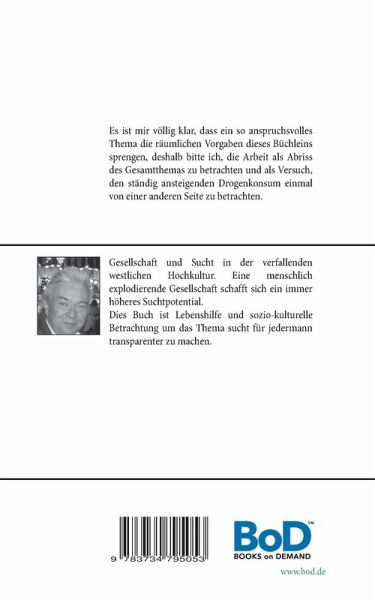 Es ist mir völlig klar, dass ein so anspruchsvolles Thema die räumlichen Vorgaben dieses Büchleins sprengen, deshalb bitte ich, die Arbeit als Abriss des Gesamtthemas zu betrachten und als Versuch, den ständig ansteigenden Drogenkonsum einmal von einer anderen Seite zu betrachten. Im wesentlichen untersuche ich zwei große Blöcke, den Suchtbegriff und den Moralbegriff. Danach gilt es die gewonnenen Erkenntnisse in einen neuen Zusammenhang zu setzen.In einem folgenden, umfangreicheren Werk werde ich dezidierter auf die Problematik eingehen. Mit diesem Abriss möchte ich ein kleines Taschenbuch für jedermann schaffen, der nicht allzu tief in die Materie eindringen will, aber eine gute Kurzinformation braucht, um mit jugendlichen diskutieren zu können und um die eigene Position zu überprüfen. Ein tiefer gehendes Werk wird demnächst folgen.